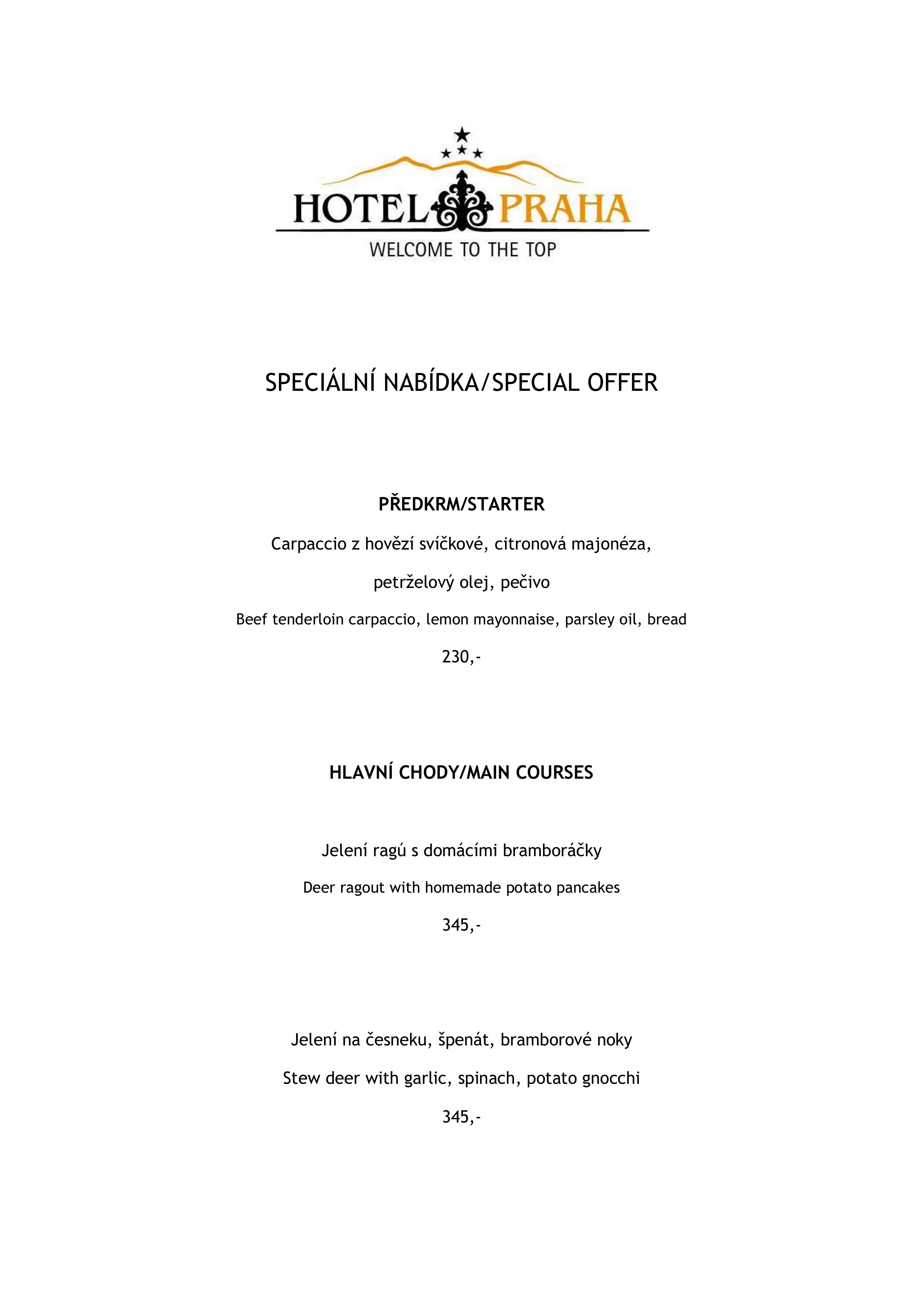 Přijďte si vychutnat naši aktuální speciální nabídku, kterou pro vás připravil tým kuchyně Hotelu Praha ve Špindlerově Mlýně.
